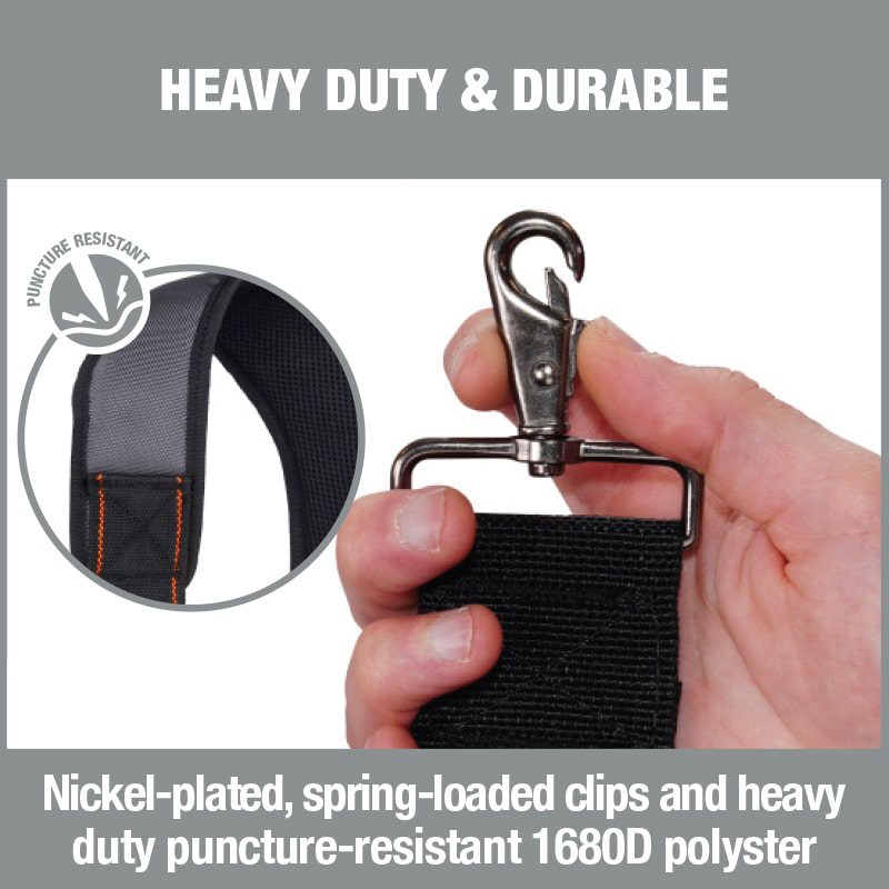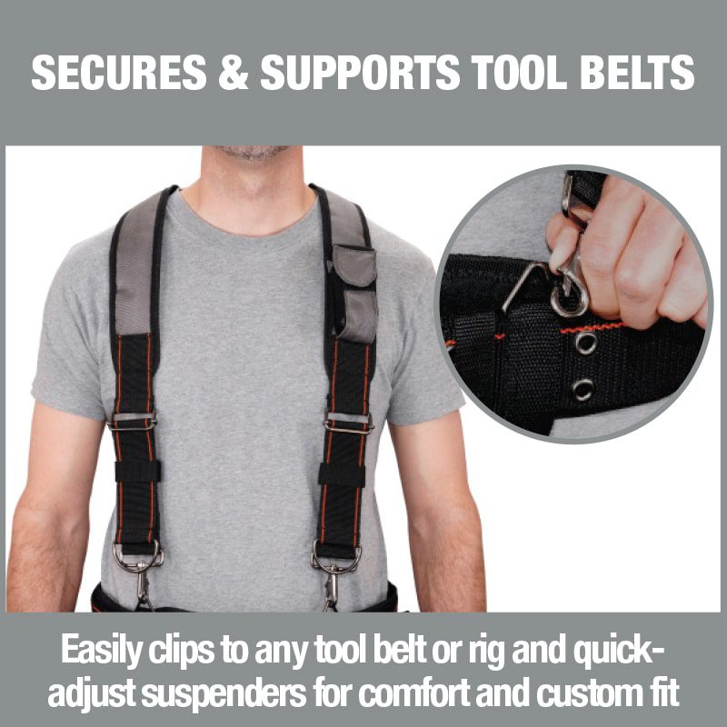 - SECURES & SUPPORTS TOOL BELTS – Spring-loaded clips easily attach to any tool belt or rig