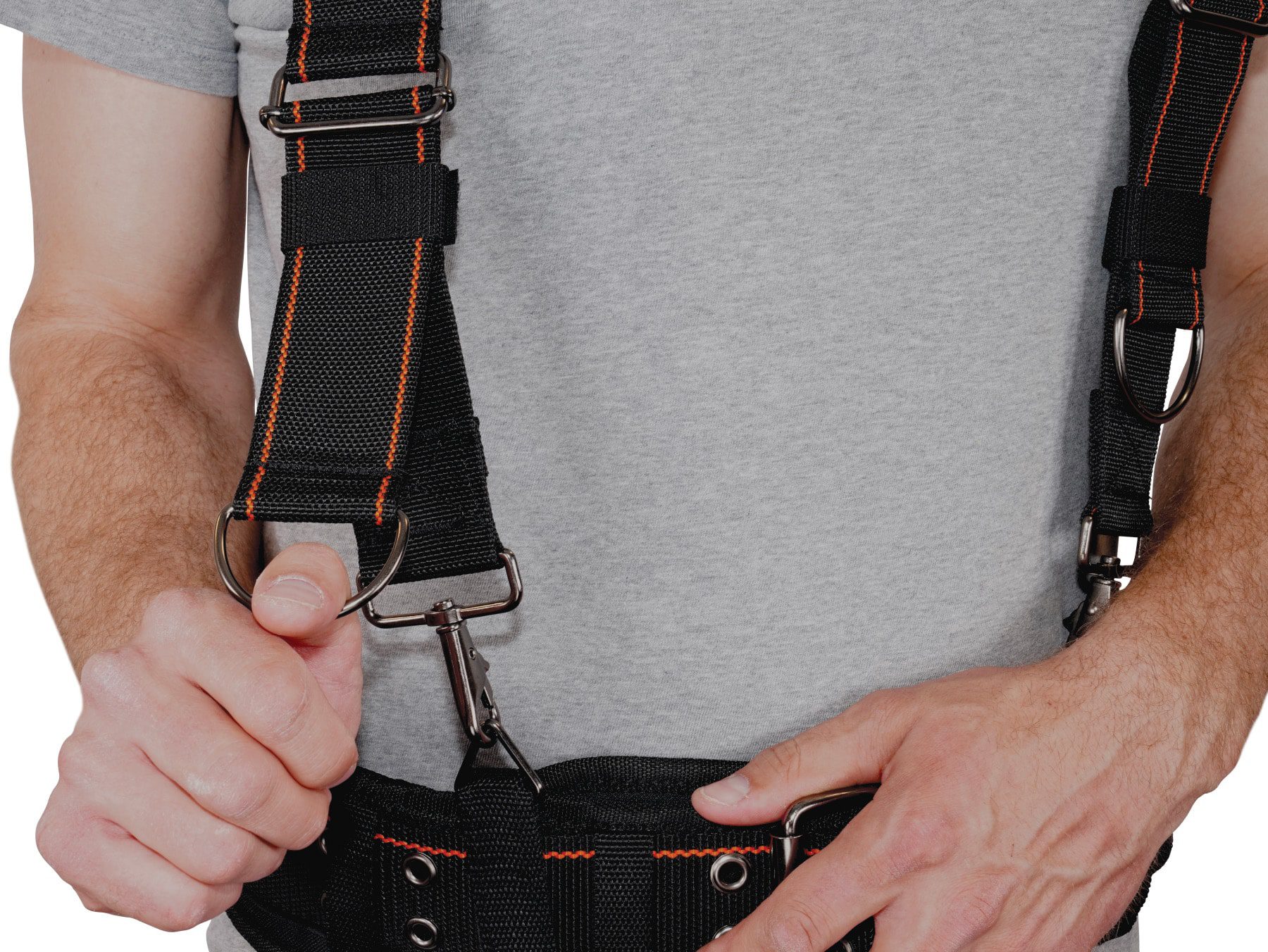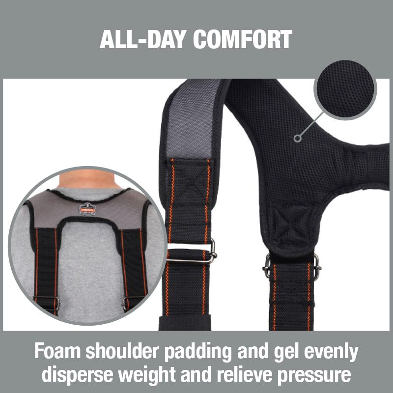 The Arsenal® 5560 Tool Belt Suspenders are built for all-day comfort while securing tool belts. Thick foam shoulder padding and gel at key riding points evenly disperse weight to relieve pressure from the hips and back. Durable nickel-plated, spring-loaded clips easily secure the suspenders to any tool belt or rig.