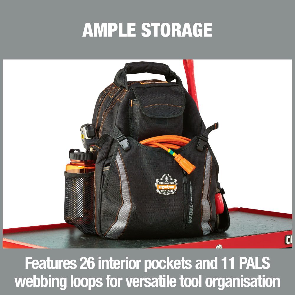 The Arsenal 5843 offers ample storage and organisation options for a variety of tools and accessories. The tall tool holster on the side panel provides quick and easy access to frequently used tools, enhancing efficiency on the job. Comfort is a key feature of this tool backpack, with padded shoulder straps and reinforced comfort padding on the back, ensuring ease of wear even during extended periods. For added versatility, the backpack includes ring attachment points for carabiners and other connectors, making it easy to attach additional gear. This tool backpack is the practical choice for any professional.