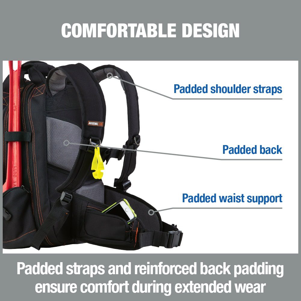 • COMFORTABLE TO WEAR – Padded shoulder straps and reinforced comfort padding on the back