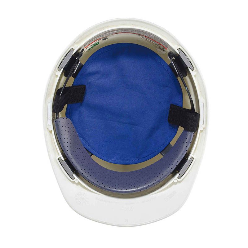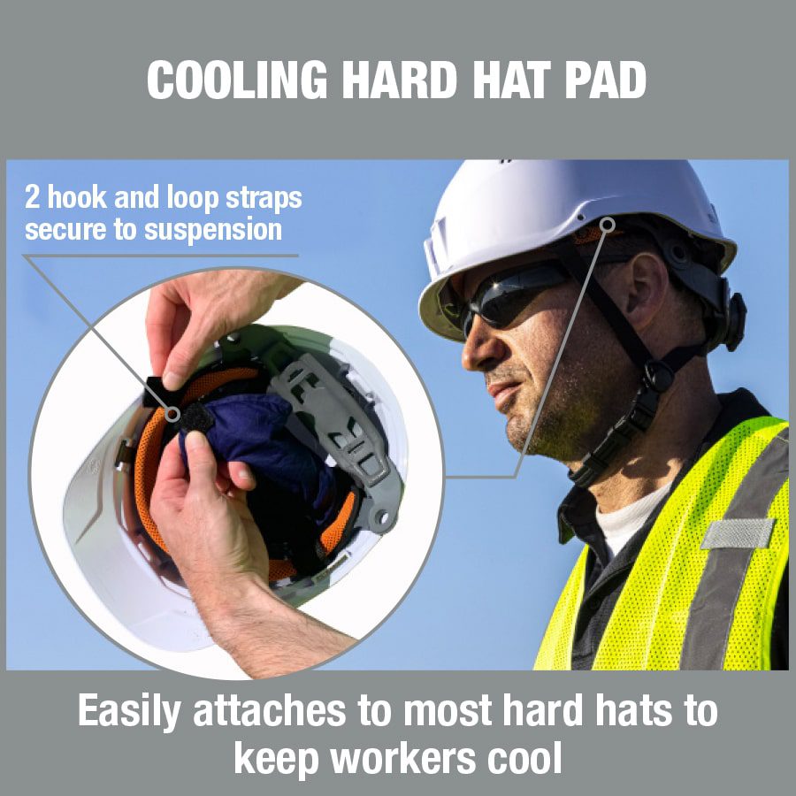 This hard hat liner fits most hard hats and safety helmets, easily and securely attaching to the suspension with two hook and loop straps. Heat-related illness continuously ranks among the top causes of worksite accidents and fatalities. Evaporative cooling technologies such as polymer crystals are a simple, effective and comfortable solution for heat stress prevention. Similar to how sweat cools the body, evaporative technologies use an external water source to draw heat away—helping to regulate body temperature while providing cool relief. When activated, this cooling hard hat pad is comfortable and refreshing for even the hottest days of the year.