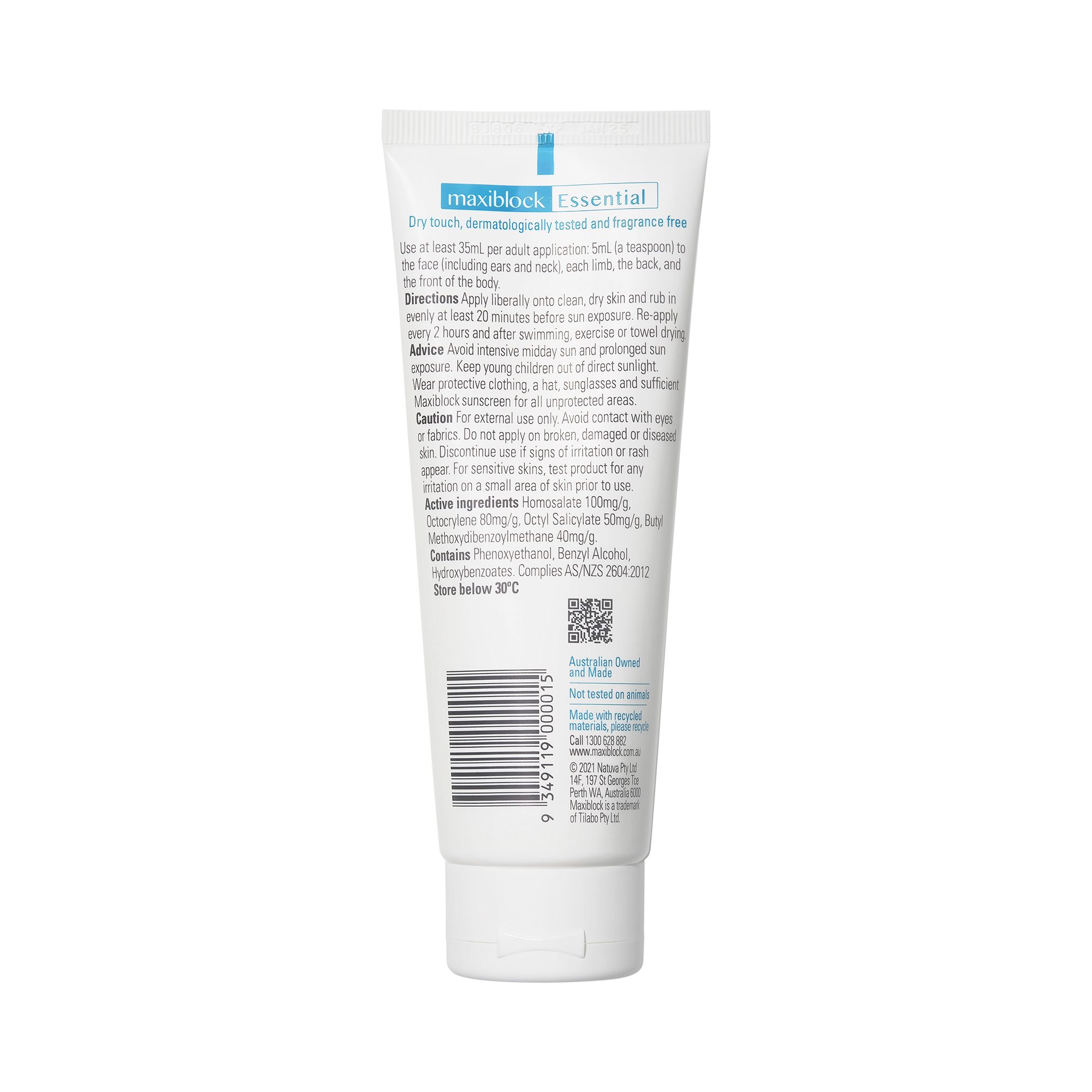 Australian-made and owned since 1979, Maxiblock is the sunscreen that the locals trust. We all need the best protection against the harsh sun and with the Essential Sunscreen – 100ml Tube, Maxiblock has created a smart range of high-quality sunscreen suitable for all skin types. The Essential Range is a non greasy SPF50+ sunscreen lotion and is the perfect choice for worksites, providing an effective barrier against the harsh sun. The Maxiblock Essential Range is easy to apply and is non-greasy, and it features a non-irritant formula, so it won’t irritate skin. The Maxiblock Essential Range comes in a multitude of convenient packaging and sizes, from to personal lip balms, 100ml and 200ml tubes, 250ml spray, and 500ml and 1L pump bottles, to makes it easy to apply and top up throughout the day. Use at least 35ml per adult application: 5ml (a teaspoon) to the face (including ears and neck), each limb, the back, and the front of the body.