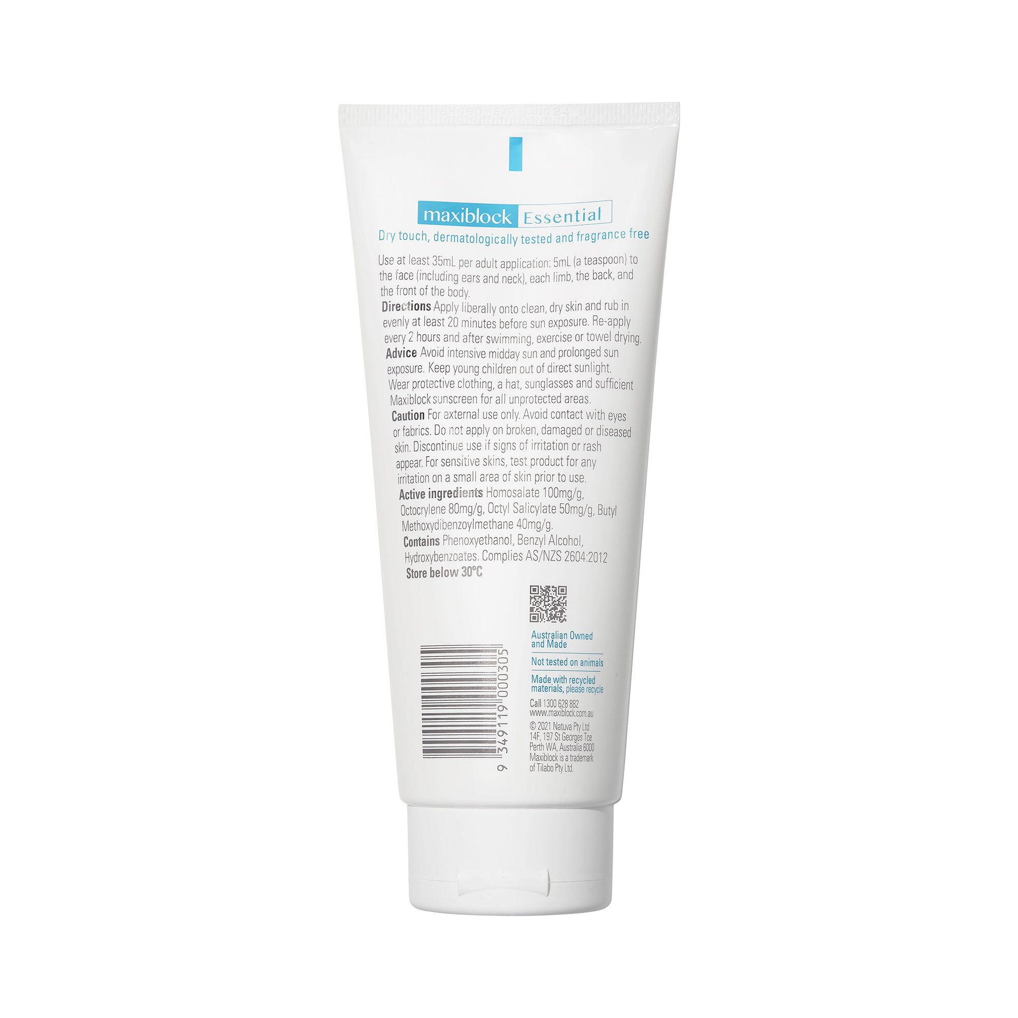 Australian made and owned since 1979, Maxiblock is the sunscreen that the locals trust. We all need the best protection against the harsh sun and with the Essential Sunscreen 200ml – Tube Maxiblock has created a smart range of high-quality sunscreen suitable for all skin types. The Essential Range is a non greasy SPF50+ sunscreen lotion and is the perfect choice for worksites, providing an effective barrier against the harsh sun. The Maxiblock Essential Range is easy to apply and is non-greasy, and it features a non-irritant formula, so it won’t irritate skin. The Maxiblock Essential Range comes in a multitude of convenient packaging and sizes, from to personal lip balms, 100ml and 200ml tubes, 250ml spray, and 500ml and 1L pump bottles, to makes it easy to apply and top up throughout the day. Use at least 35ml per adult application: 5ml (a teaspoon) to the face (including ears and neck), each limb, the back, and the front of the body.