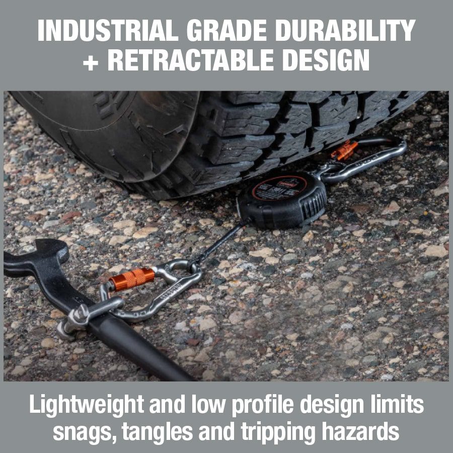 The anchoring end of the retractable features a swivelling carabiner connection for anchoring to d-rings or other locations. The connecting end of the cord has a patented Squids double-action carabiner to secure to a hand tool weighing up to 3.6 kg.