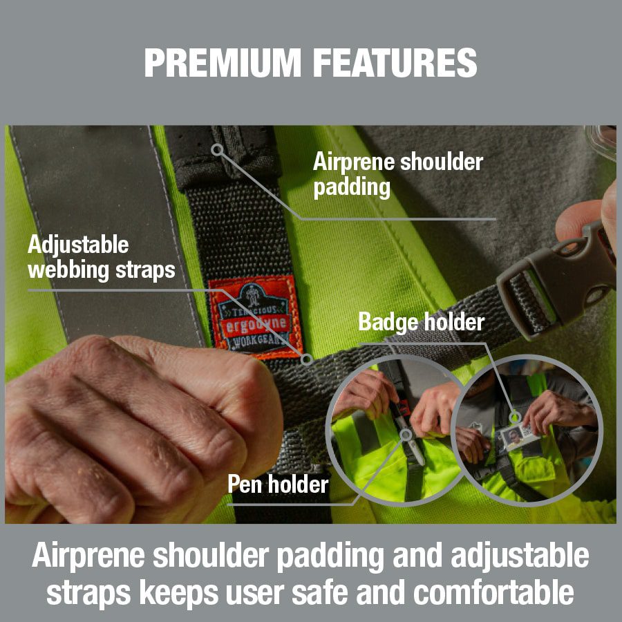 - ALL-DAY COMFORT – Airprene shoulder padding, plus curved webbing straps that form to worker’s body for easy adjustment and comfort
