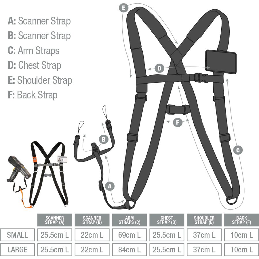 The Scanner Harness + Lanyard comes in small and large sizes, each adjustable to accommodate a variety of body sizes. Additional/replacement loop attachments are sold separately in packs of 10.