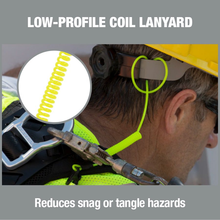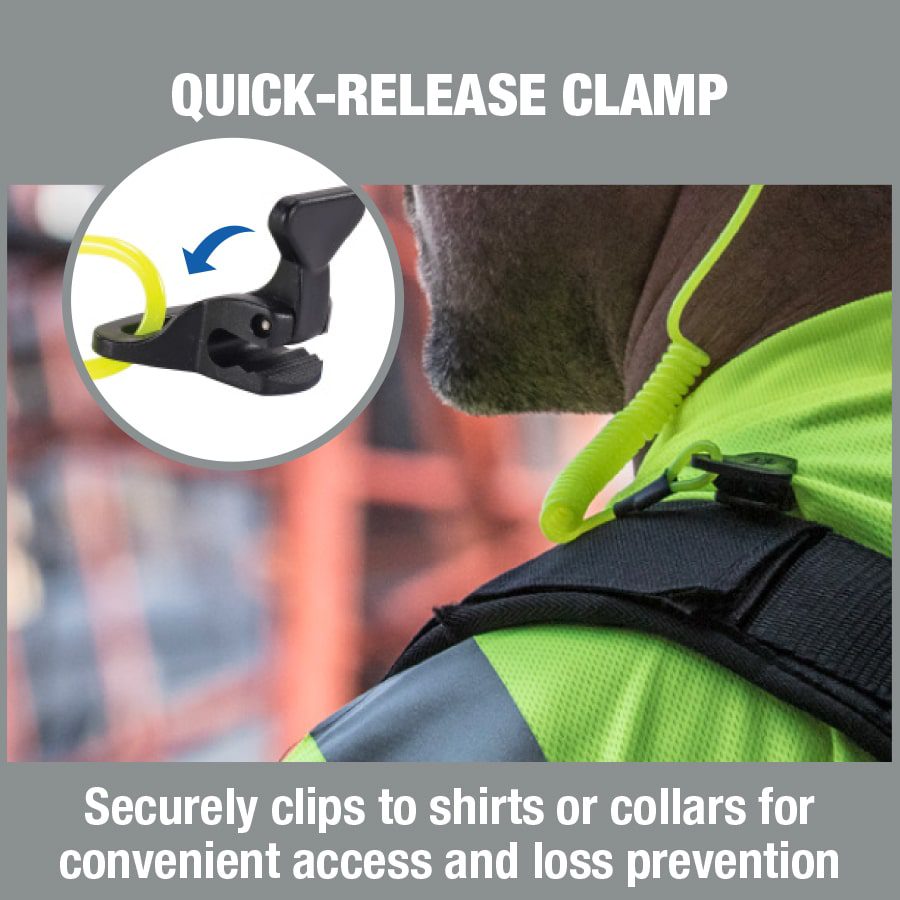 Built and tested to endure tough conditions and rated to support weight up to 0.9kg, the coiled lanyard is made with a low-profile design and durable plastic. With a quick-connect clamp on one end, it easily and securely connects to shirts, vests and other fabrics, even while wearing gloves. The coiled tether design reduces lanyard length to prevent snag and tangle hazards. The coil stretches from a compact 30cm to 122 cm.