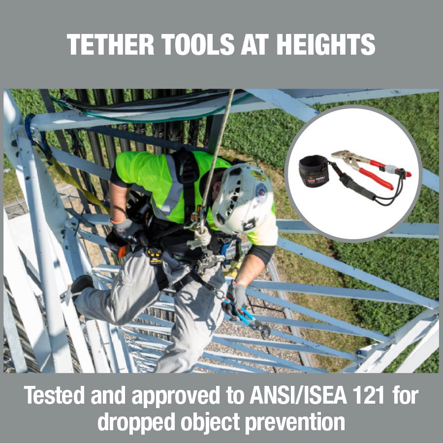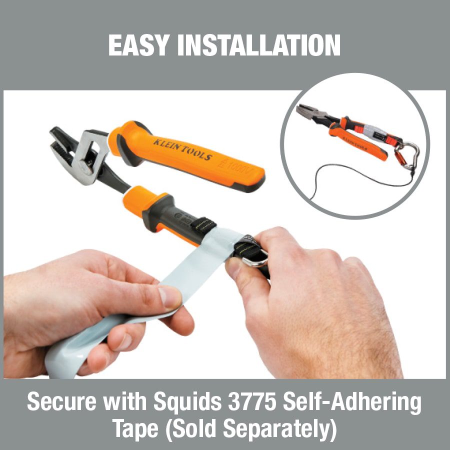 For best use, tape the loop end of the tool tail with Squids 3755 Self-Adhering Tape Trap. Available in three sizes: short, medium and long. When working at-heights, it’s essential to tether your tools. Fall protection lanyards and tethers are pieces of safety equipment designed to attach one end securely to a fixed anchor point, and the other to an appropriate attachment point on a tool by proper tethering.