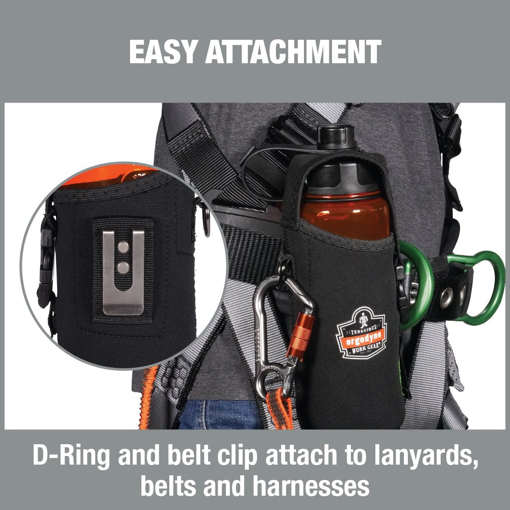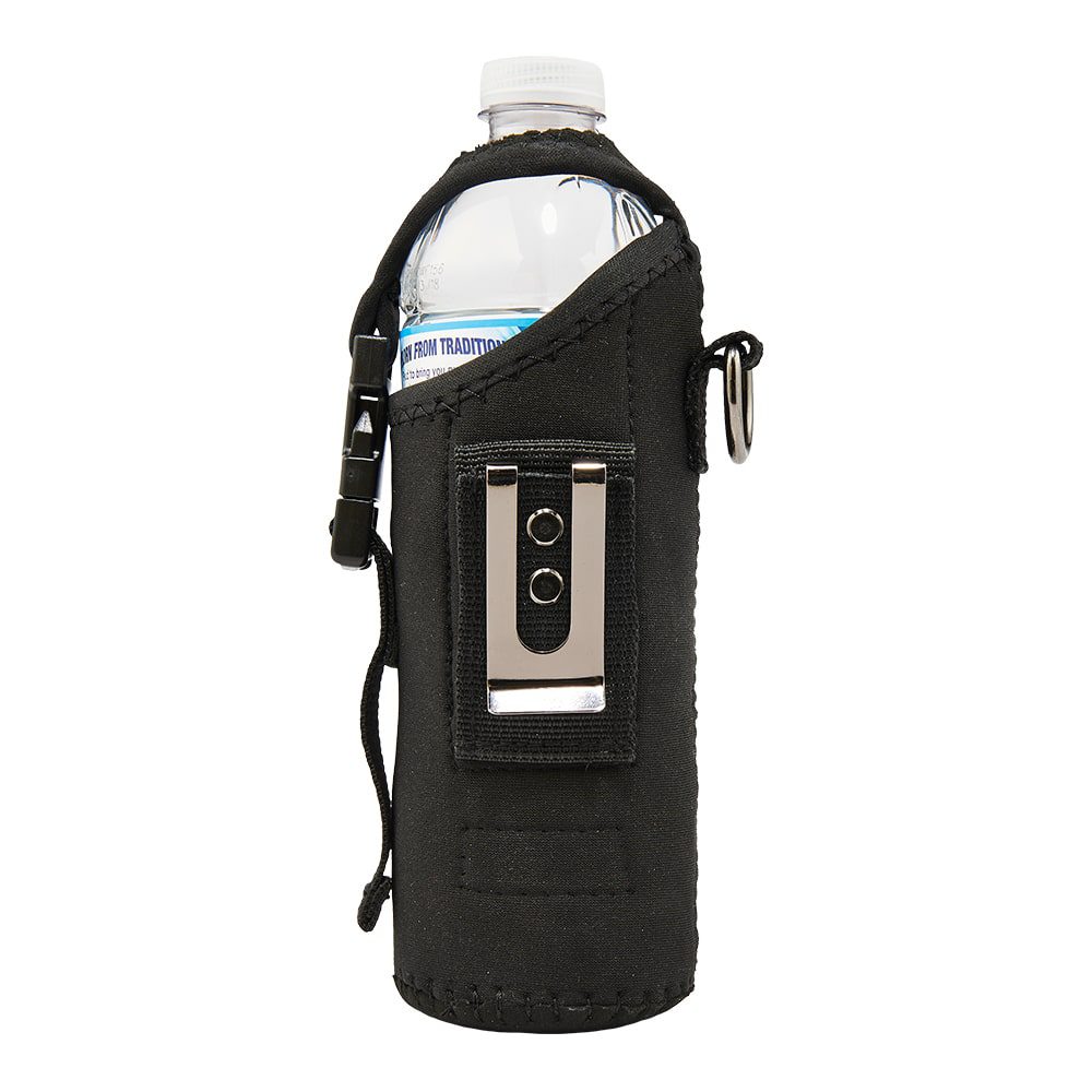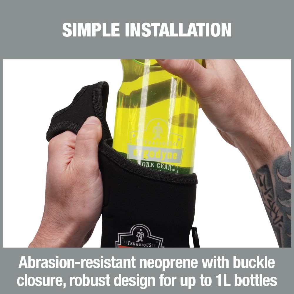 Crafted from abrasion-resistant neoprene, the holder stretches to accommodate 1L containers, including standard plastic water bottles, or even a can of WD40. An adjustable webbing strap with a buckle closure system securely holds bottles and cans in place, providing peace of mind during use. Heavy-gauge nylon stitching reinforces the holder, ensuring it withstands rigorous use and environments.