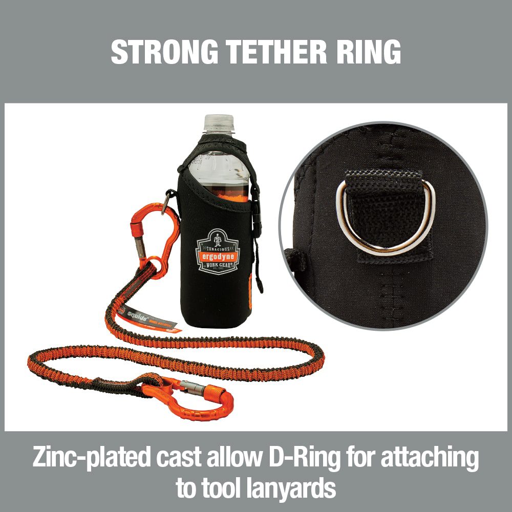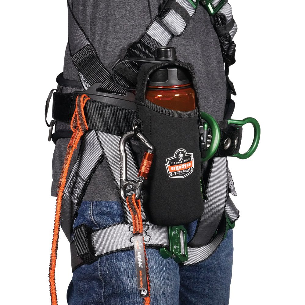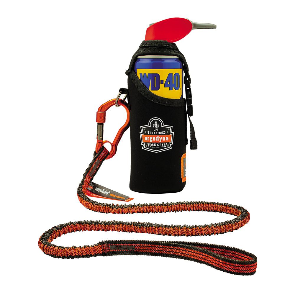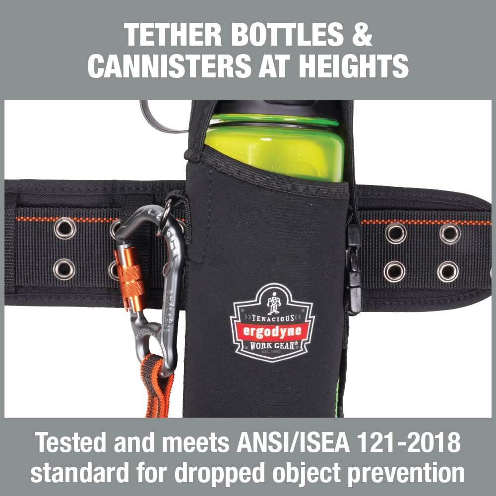 The Squids 3775 Can/Bottle Holder + Trap provides a secure and convenient way to carry and tether water bottles, spray bottles, aerosol cans, and similar-sized canisters to prevent dropped objects while working at heights or in any elevated environment.